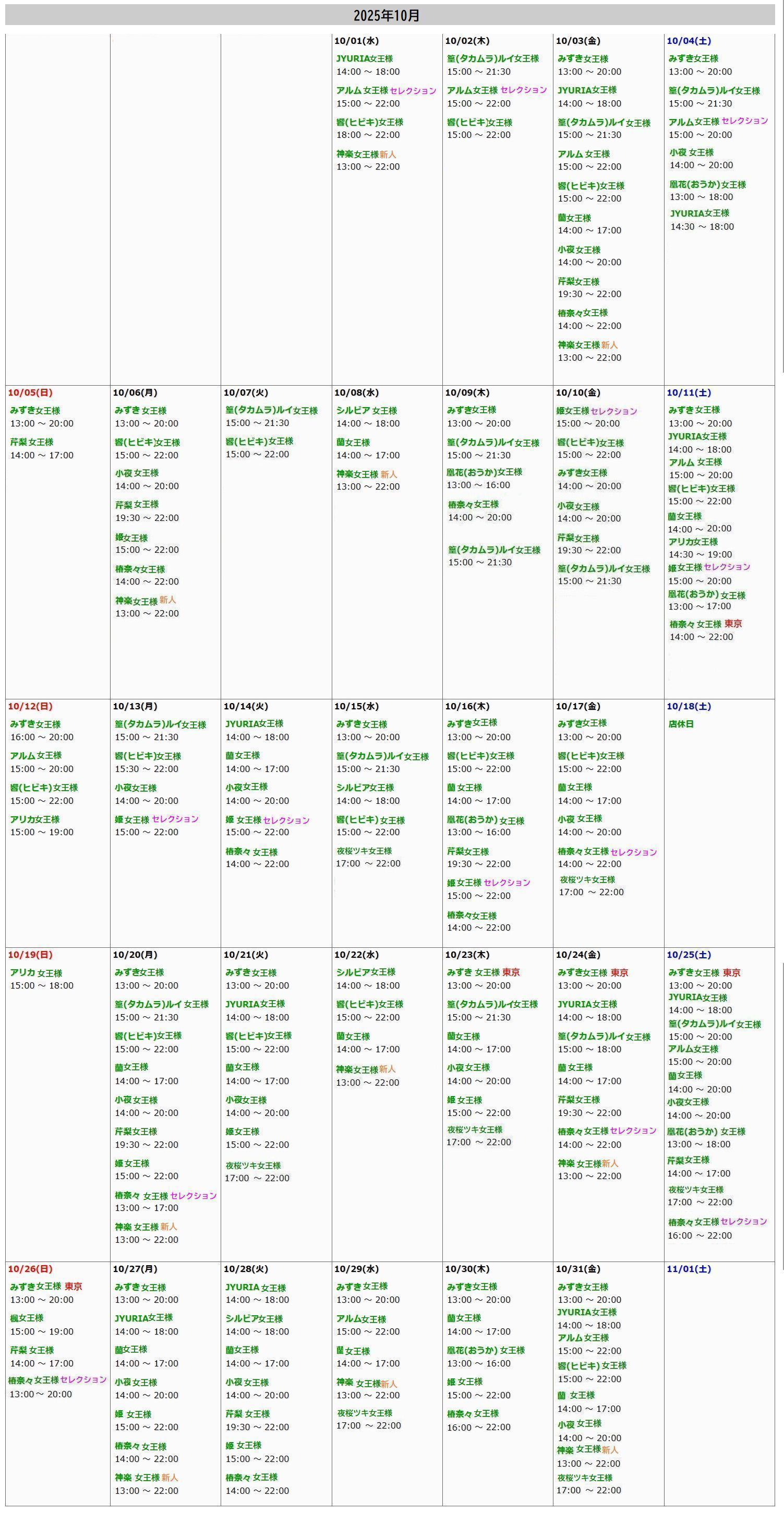 各女王様のシフト詳細はプロフィールの「基本出勤シフト」「出勤情報」をご参照下さい