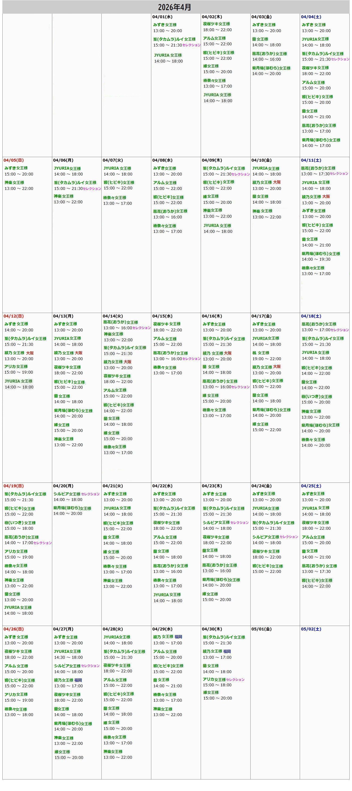 大阪 十三 M専科 女王様専門店 クラブドミナ 月間出勤表