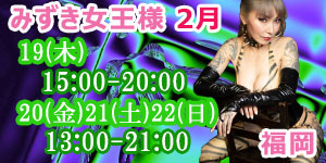 [01/10 03:05]みずき女王様 2月福岡予約 ※出張料金+2000円 20(金)・21(土)・22(日) 13:00-21:00 みずき女王様ご予約空き状況